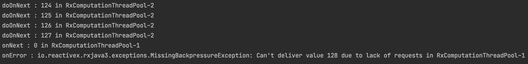소비자 측은 RxComputationThreadPool-1에서 데이터를 처리하는 것을 확인할 수 있고, 생산자는 127까지 통지하고 더이상 통지하지 않습니다. 소비자 측에서는 생산자 측에서 통지한 데이터 0만 처리한 후 MissinBackpressureException이 발생한 것을 확인할 수 있습니다. 생산자 측에서 통지하는 속도가 소비자 측에서 처리하는 속도보다 월등히 빨라 Exception이 발생한 것을 의미합니다.
