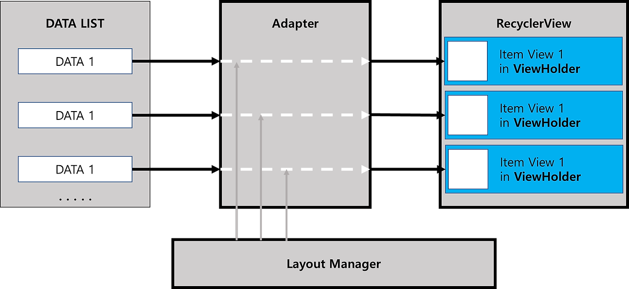 RecyclerView는 데이터 목록을 아이템 단위의 View로 생성해서 화면에 표시하기 위해 Adapter를 사용합니다. Adapter에 의해 생성된 View 객체를 어떤 방식으로 나열할지 결정하기 위해서 Layout Manager를 이용합니다. 끝으로 Layout Manager가 제공하는 레이아웃 형태로, Adapter를 통해 각 아이템 뷰는 ViewHolder 객체에 저장되어 화면에 표시하게 되고, 재활용됩니다.