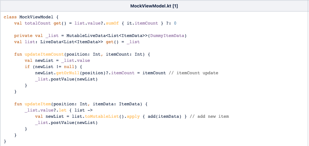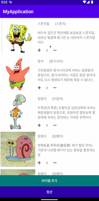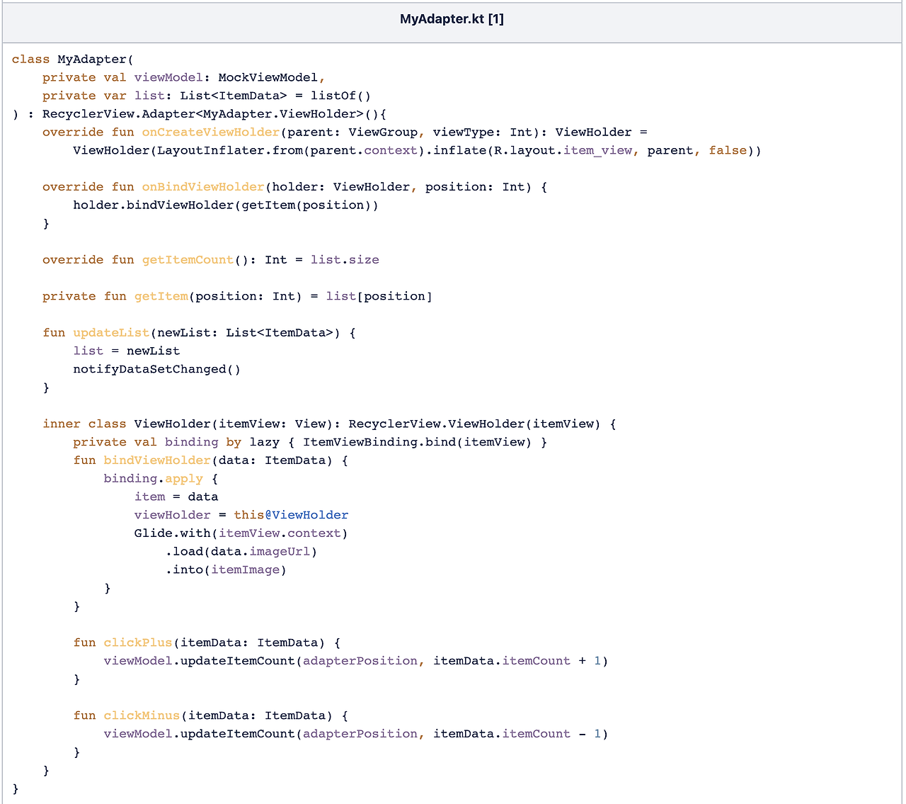 기존 샘플코드와 같이 하나의 아이템의 + 버튼을 클릭할 때마다 notifyDataSetChanged() 로 UI 를 업데이트하는 것은 "0" 이라는 텍스트를 "1" 로 변경하고 싶을 뿐인데, 전체 item 을 재배치하고 재구성하게 되는 것이기에 비효율적입니다.