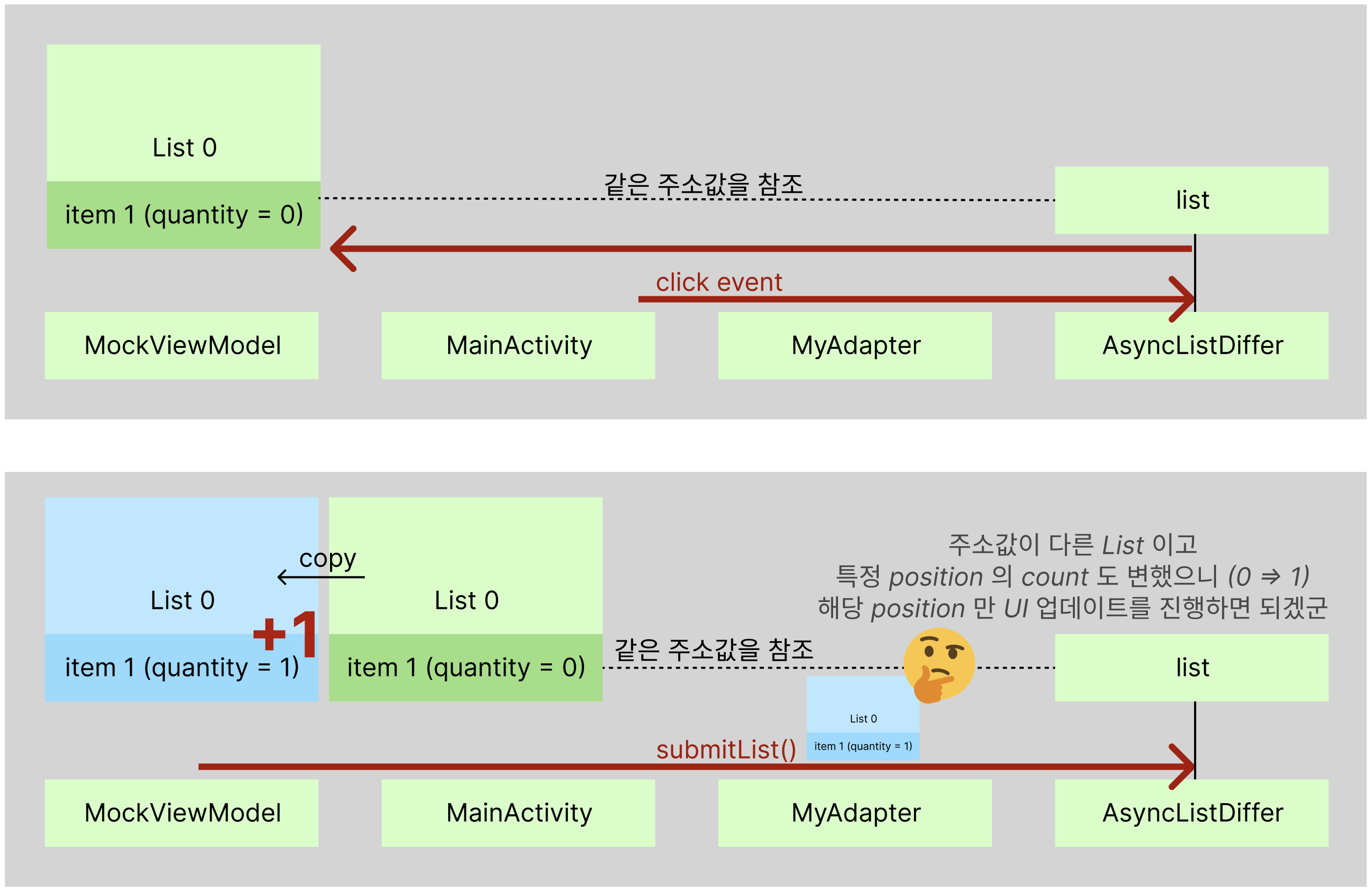 현재 코드는 AsyncListDiffer.list 값이 viewModel 에서 제공하는 List 와 동일한 주소값으로 연결되어 있습니다.