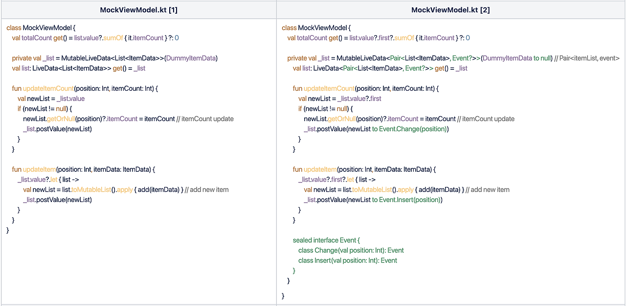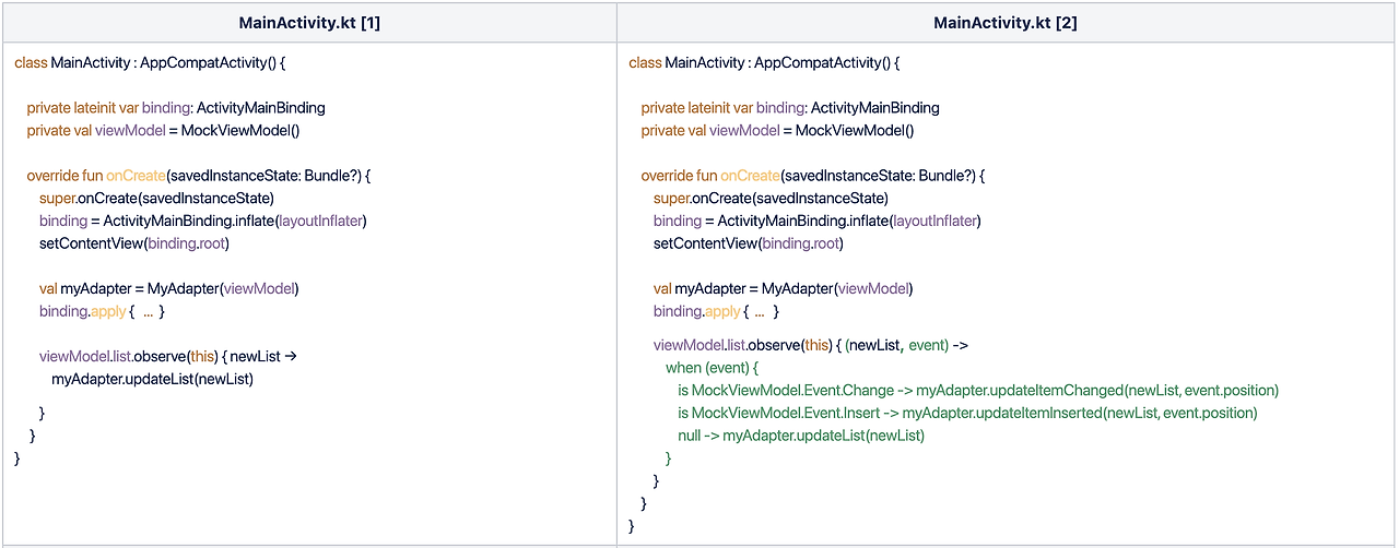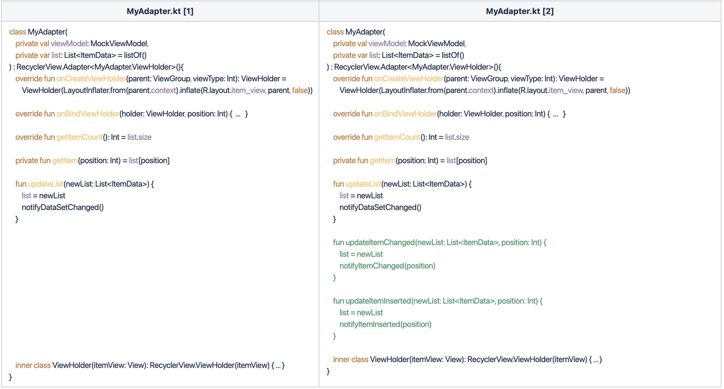 하지만 모든 RecyclerView 마다 위와 같이 이벤트 종류를 정의하고 알맞은 notify 함수를 적용하는 것은 개발자로선 무척 번거로운 일입니다.