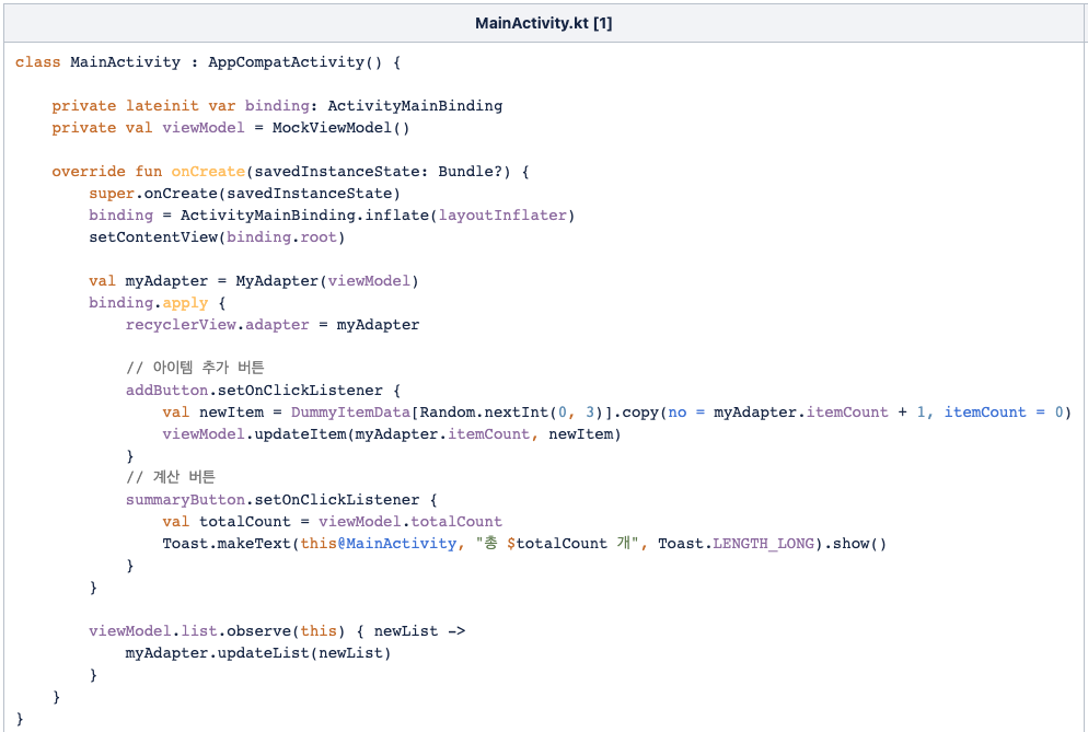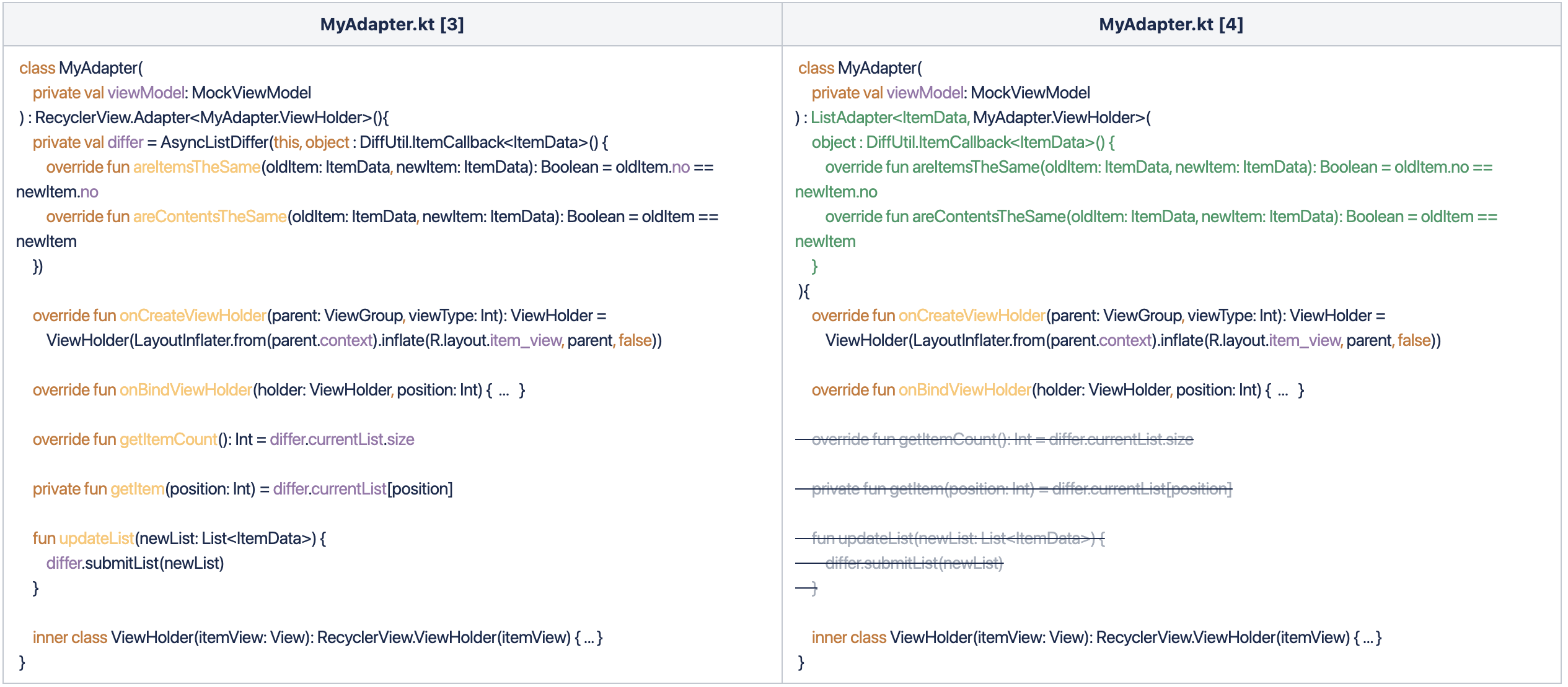 그래서 ListAdapter 를 적용해 보면 필요하거나, 자주 쓰는 코드들이 이미 만들어져 있기 때문에 이전보다 코드 양이 더 줄어든 것을 확인할 수 있습니다.