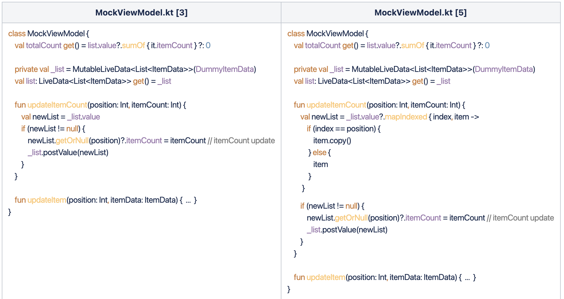 이러한 문제점은 submitList() 의 인자로 deep copy 한 List 를 수정 후 전달하여 해결할 수 있습니다.