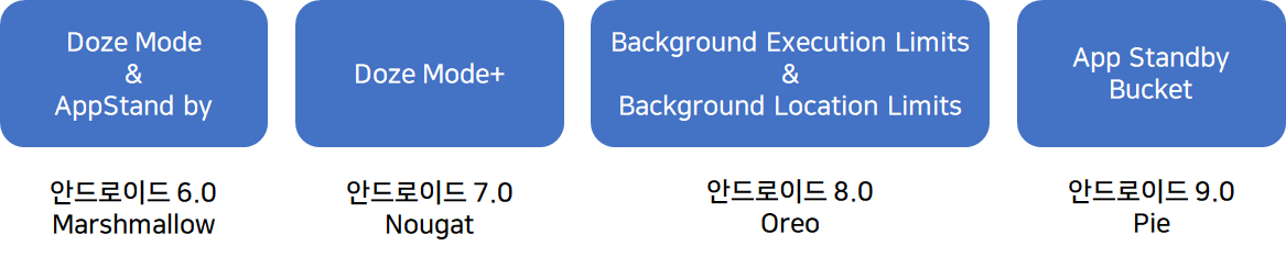 | Battery Saver (절전) | 제한 | 제한 | 제한 | 가능 | 스크린 off 동안 | Foreground에서는 가능 |