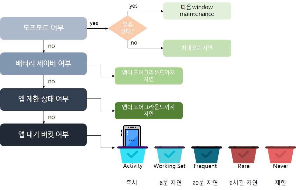 | Doze Active | 다음 maintaince window | 일반 알람: 다음 maintaince window 유휴 상태 중 알람: 최대 9분 연기됨 |