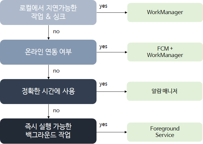 해당 글에서는 WorkManager까지 다루지는 않을 것이다. 하지만, 각종 백그라운드 제한 사항이 생김에 따라서, 고려해야할 사항이 많은데 그럴 때 손 쉽게 해결할 수 있는 해결책 중 하나는 WorkManager이다. 또한 모든 것의 정답은 WorkManager는 아니다. 아래와 같은 상황 때, WorkManager를 사용하게 되면 손 쉽게 해결 할 수 있다.