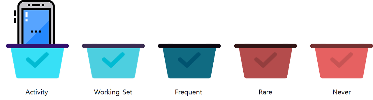 pie 버전에서는 App Standby bukets이 추가되었습니다. 앱의 상태를 다섯가지로 구분지어 최근에 얼마나 자주 사용되었는가를 기준으로 실행시키게 됩니다. Active, WorkingSet, Frequent, Rare, Never의 상태로 나누어서 5가지로 구분을 하고, 해당 상태에 따라서, FCM, Network, Alarm, Job등 각자의 기능들을 지연시키거나 제한합니다. 해당 기준은 안드로이드의 알고리즘을 통해서 머신러닝이 구분짓는다고 합니다.