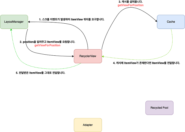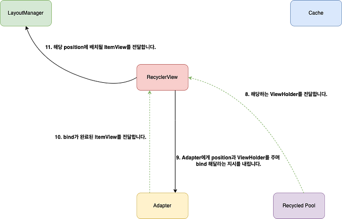 그렇지 않고 계속 캐시에 저장할 필요가 있는 경우, (4) Cache에 계속 저장하라는 지시를 내리고, 이를 통해 나중에 LayoutManager가 해당 position에 대한 ItemView를 요청할 경우 Adapter를 거치지 않고 사용할 수 있게 됩니다.