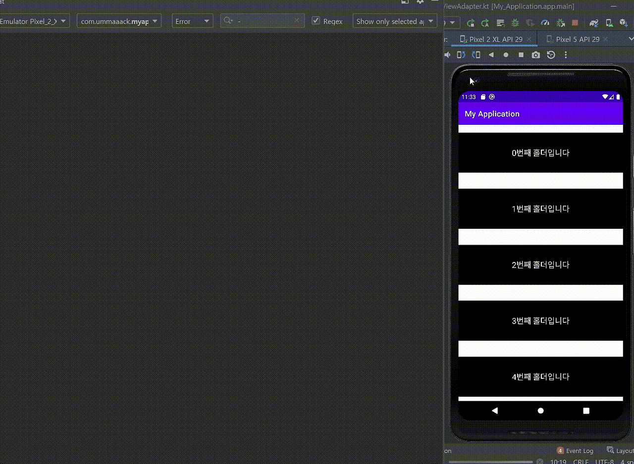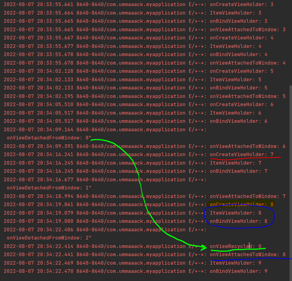정리하자면, 9번째 itemView가 나타났을 때 가장 먼저 사라졌던 0번째 홀더가 재사용됨을 알리는 onViewRecycled:0 이 호출되고 이 홀더가 9번째 홀더가되어 bind되는 것입니다.
