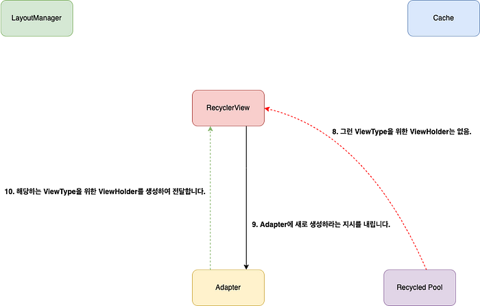 - (6) Adapter는 해당하는 ViewType을 알려주고 (7) RecyclerView는 이 ViewType을 가지고 Recycled Pool에 해당하는 ViewHolder가 있는지 물어봅니다.(getViewHolderByType 메소드)