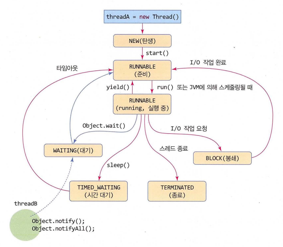 스레드 생명 주기와 스케줄링 스레드 상태 : 스레드는 JVM에 있어 생명체와 같다. 스레드는 태어나고, 실행하고, 잠자고, 대기하고, 종료하는 등 생명주기(life cycle)를 가진다. 그리고 생명 주기 동