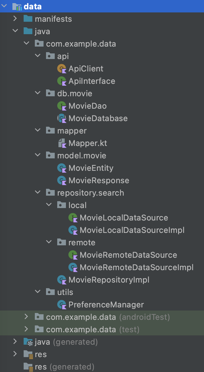 Data 모듈에서는 로컬(DB) 데이터와 서버(API) 데이터들을 모두 가져와서 사용하기 때문에 이에 대한 패키지를 만들어 구분지어 주었다.