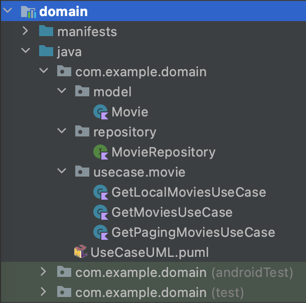 domain 모듈에서는 실제로 UI 작업에 사용할 모델 (Entity)가 필요하며, 해당 모델을 통해 원하는 데이터를 가져오기 위한 Repository Interface와 Usecase를 선언한다.